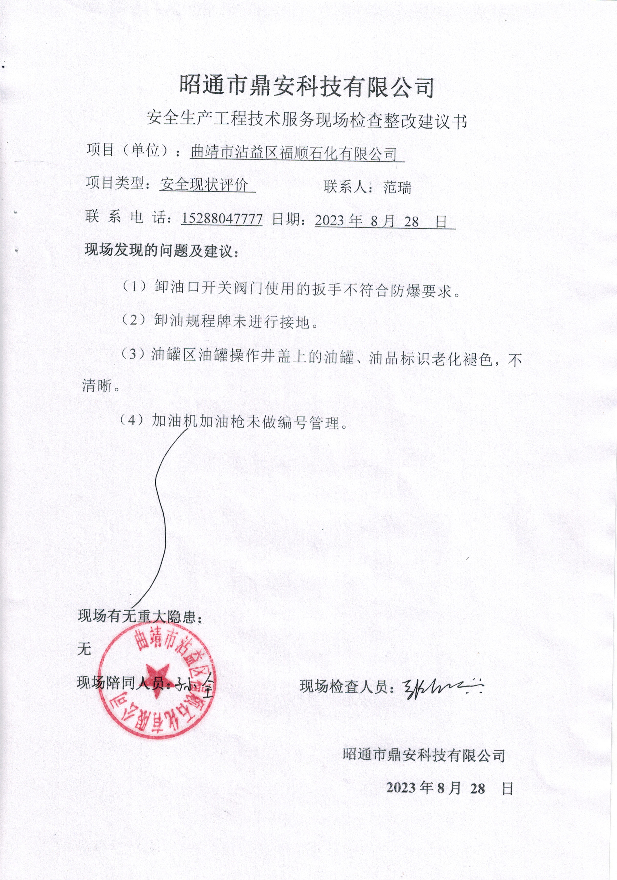 項(xiàng)目名稱 | 曲靖市沾益區(qū)福順石化有限公司安全現(xiàn)狀評價(jià)報(bào)告 | 合同編號 | DAAPQJ2023-34 | |||||