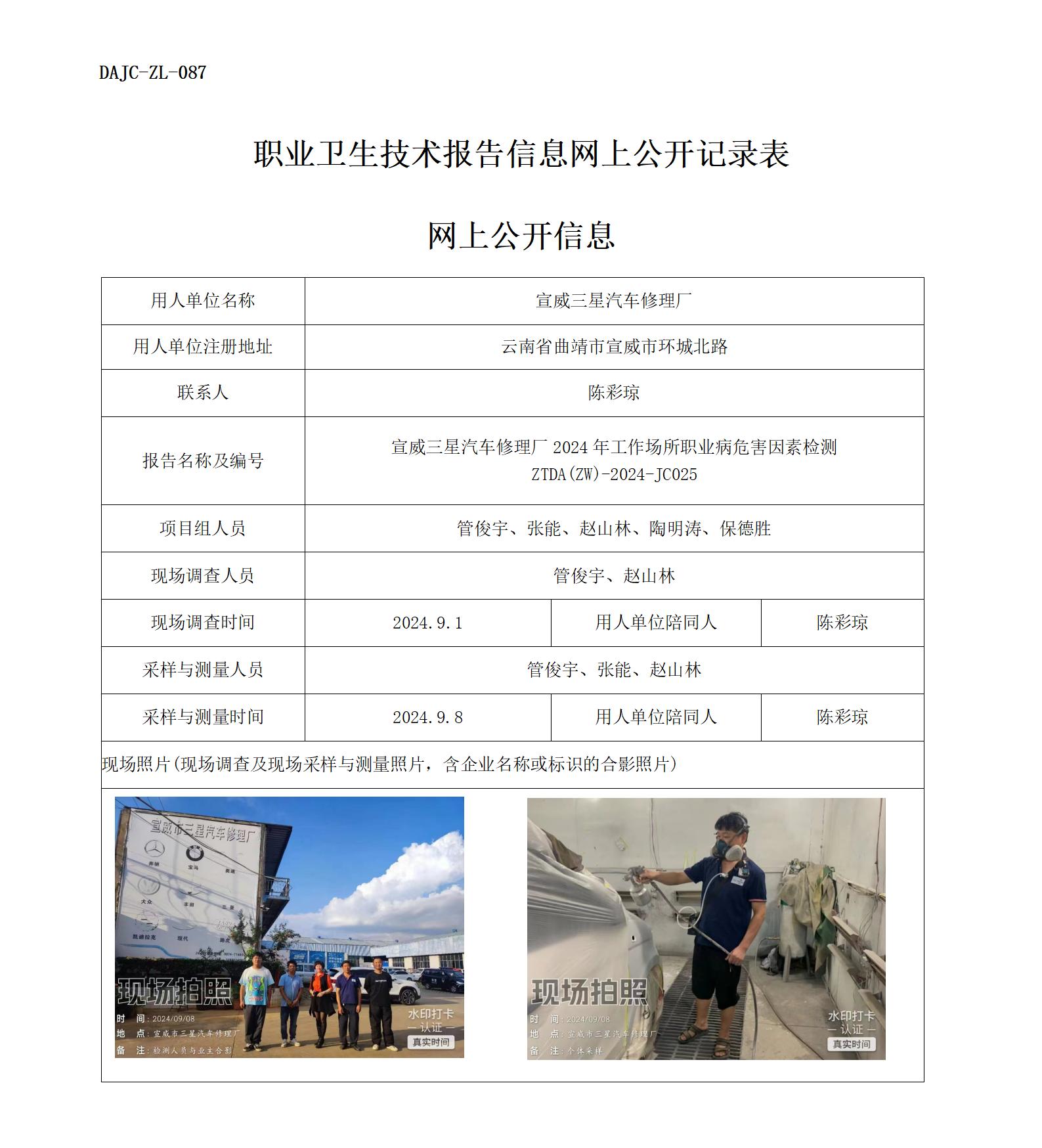 宣威三星汽車修理廠2024年工作場(chǎng)所職業(yè)病危害因素檢測(cè) ZTDA(ZW)-2024-JC025