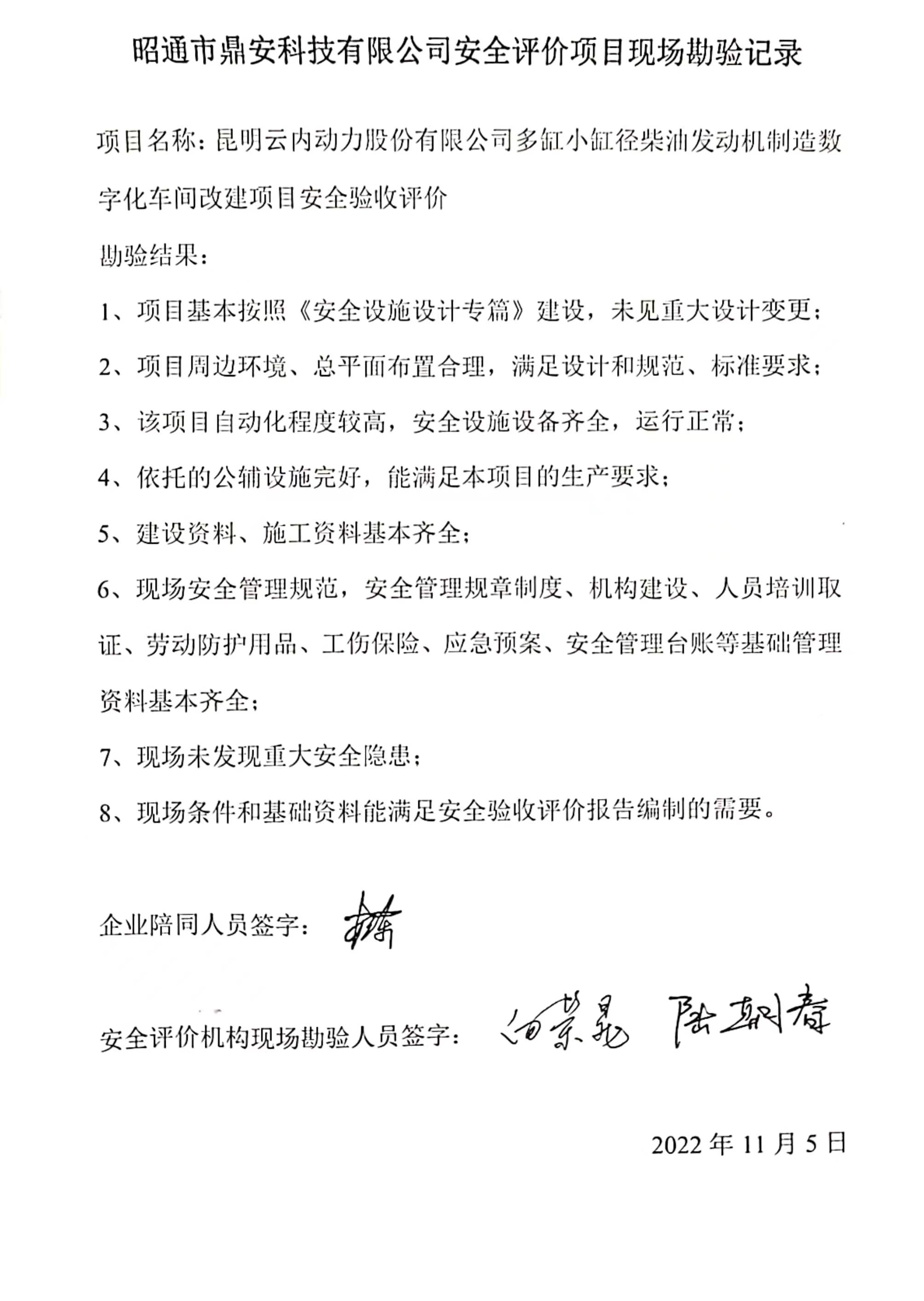 項目名稱 | 昆明云內(nèi)動力股份有限公司多缸小缸徑柴油發(fā)動機制造數(shù)字化車間改建項目安全驗收評價 | 合同編號 | DAAPKM2022-78 | |||||